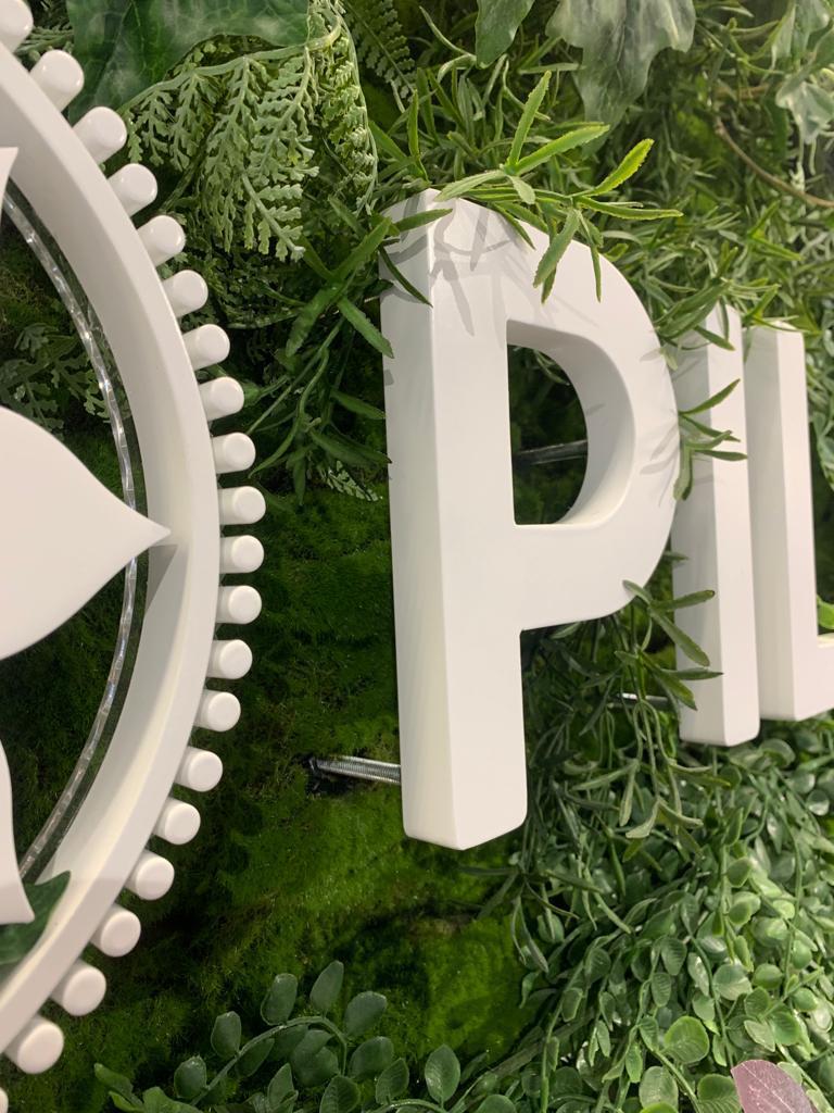 Logotip en PVC fixat amb distanciadors a la paret, sobre jardí vertical